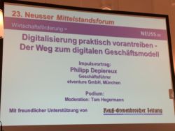 Das Mittelstandsforum der Wirtschaftsförderung moderiere ich schon seit langem zweimal im Jahr. Diesmal stand das Thema "Digitalisierung praktisch vorantreiben - der Weg zum digitalen Geschäftsmodell" im Mittelpunkt. Informiert und diskutiert wurde, wie gerade kleine und mittlere Unternehmen mit den neuen Herausforderungen umgehen können.